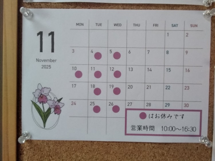 11月は毎週火、水曜と10日(月)がお休みとなりますのでよろしくお願いいたします。
