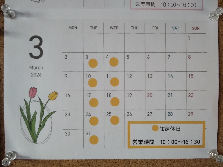 3月は毎週火曜、水曜が定休日となりますのでよろしくお願いいたします🙇